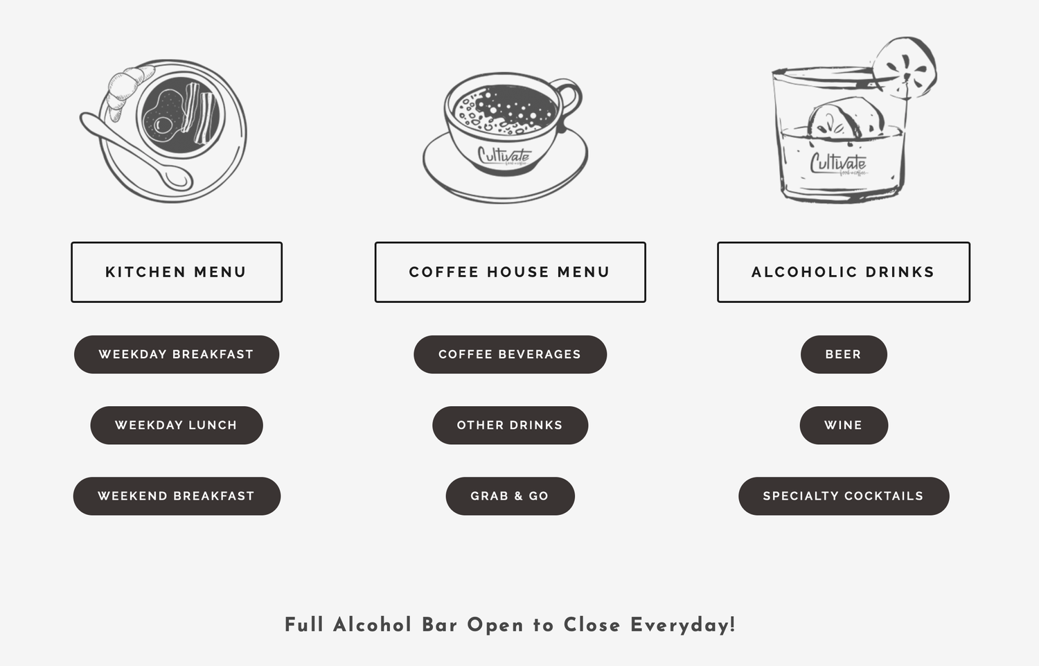 Cultivate Food and Coffee. Cultivate Food and Coffee is a full restaurant and coffee experience theyre opened 7 days a week from 8 to 3.